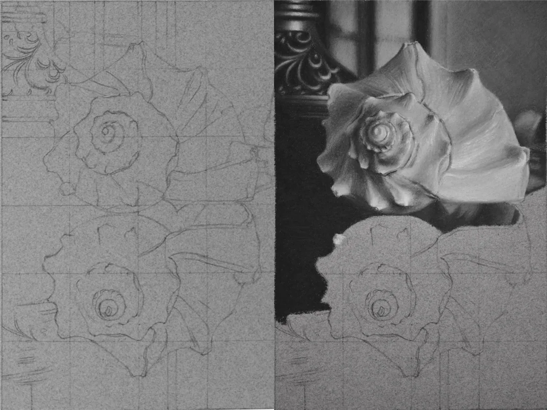 Earlier Steps in the drawing; Left: The initial grid and line drawing. Right: Early into the process of the drawing where I have begun massing in the preliminary values.