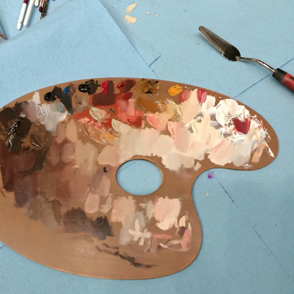 First, I scrape off all the paint except for the white. I then spread the white over the whole palette and then scrape off the white. This helps keep the palette from darkening too much over time.