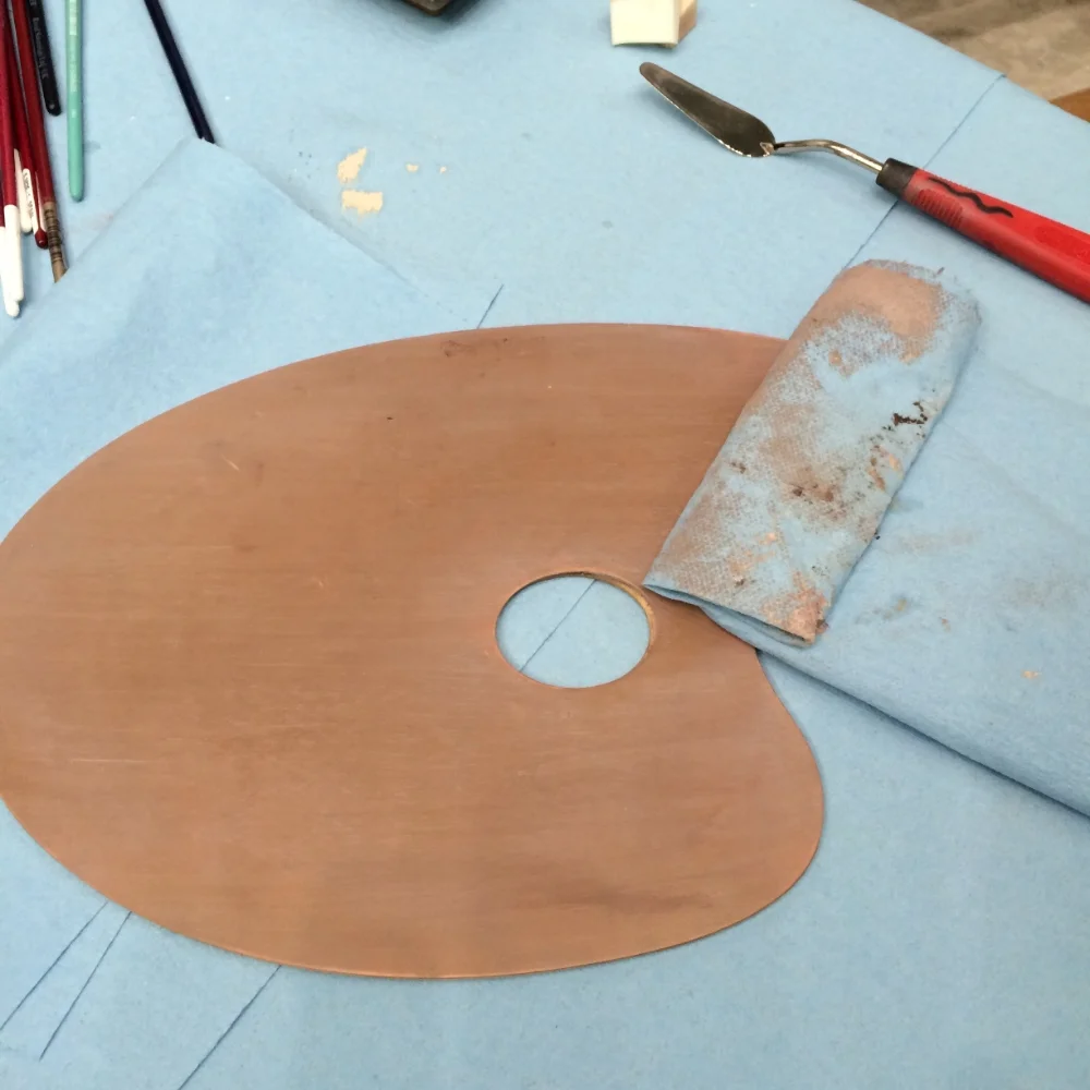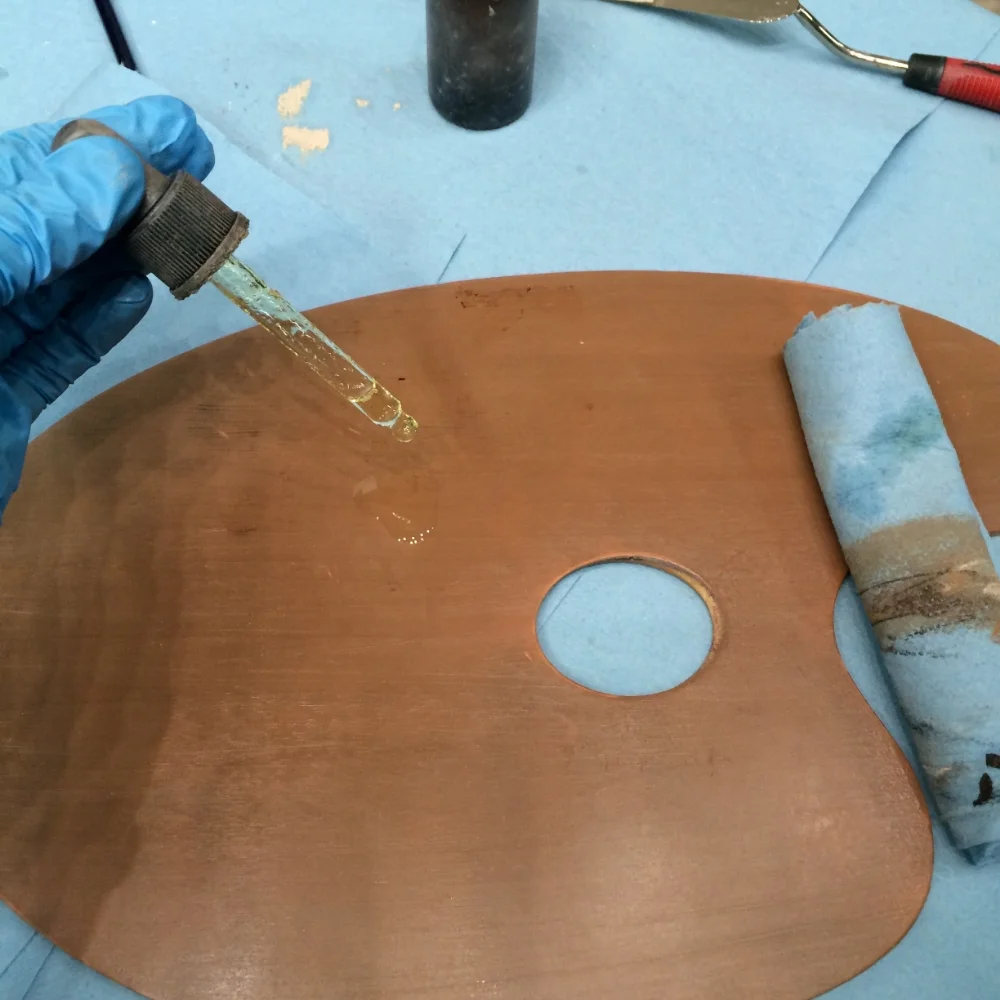 Next, I place a few drops of linseed oil on the palette and polish it with a clean part of the paper towel.