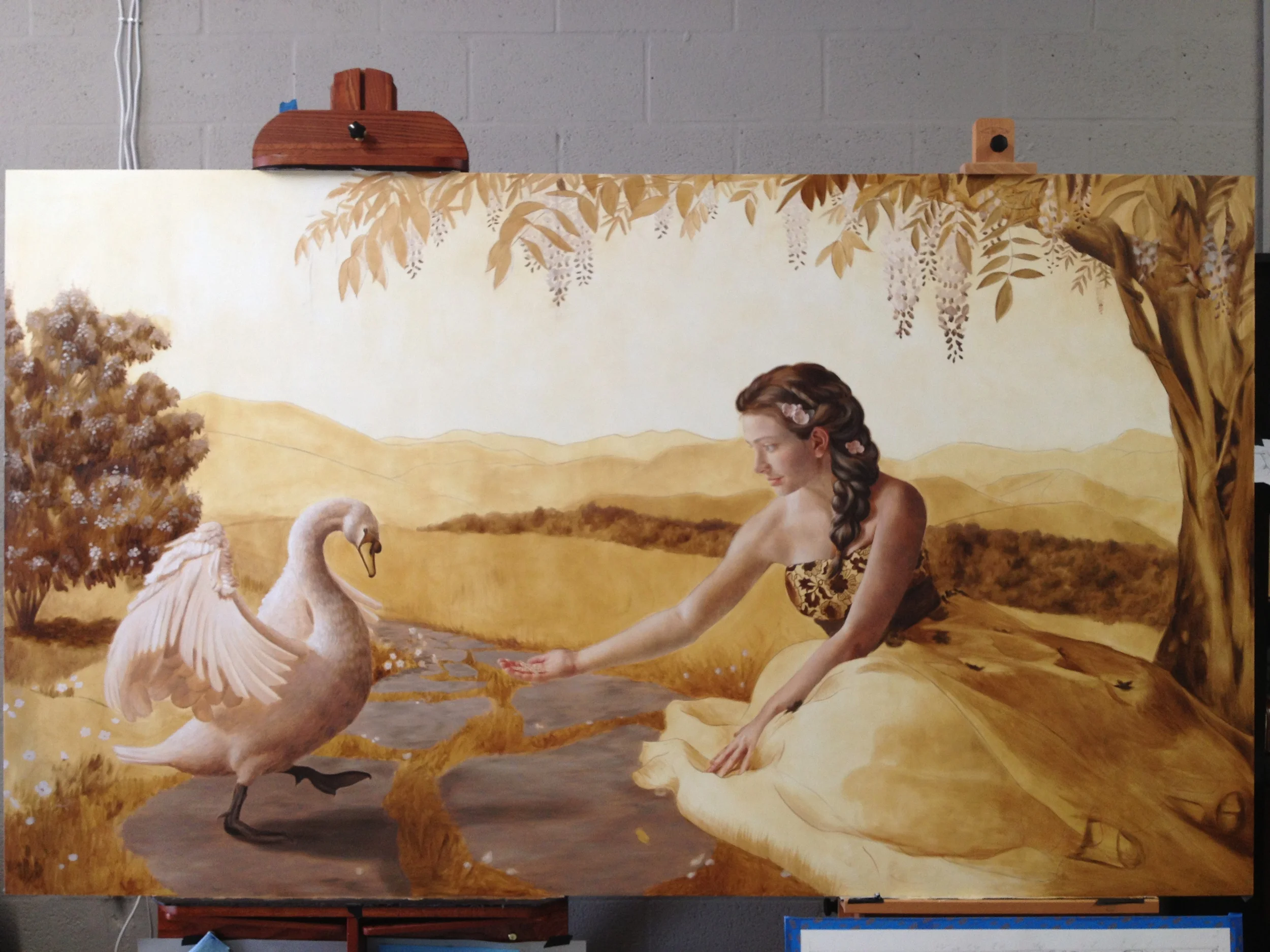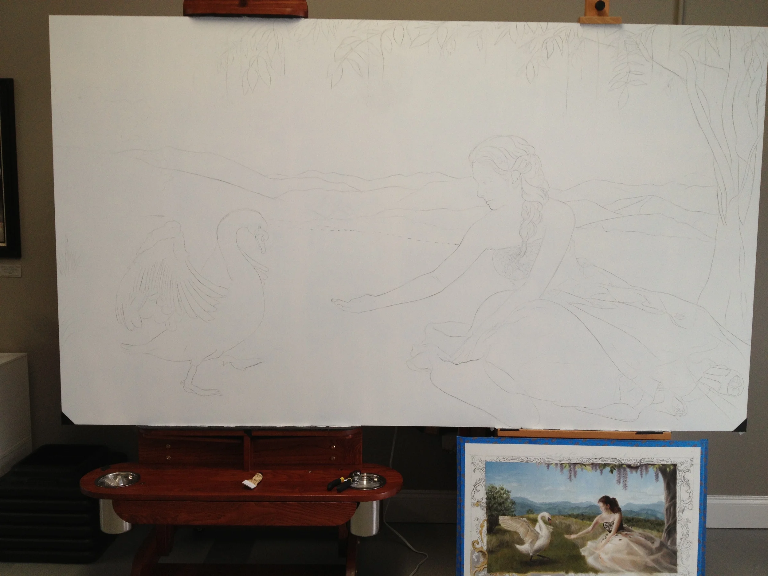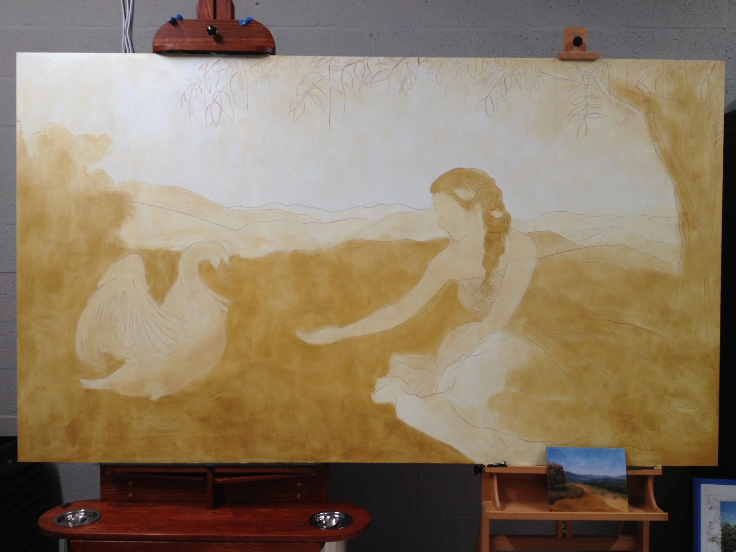 For a large work such as this I typically start with a color study depicted in the below right corner. I made a couple of compositional changes to the swan's wing, the shape of the tree and the position of the figure that really made a difference in the feel of the final painting.