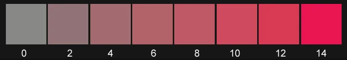 Chroma - the intensity of the color. One way to visualize chroma is the color's distance from the neutral of the same value. Chroma ranges in scale from 0 to 16. A dull color with a property of low chroma would be listed as a 2 to 4. A chroma of 0 would be comparable to a perfect neutral gray. Whereas a vivid color with a high chroma notation such as 14 would be comparable to a highly saturated red as seen in the below figure.